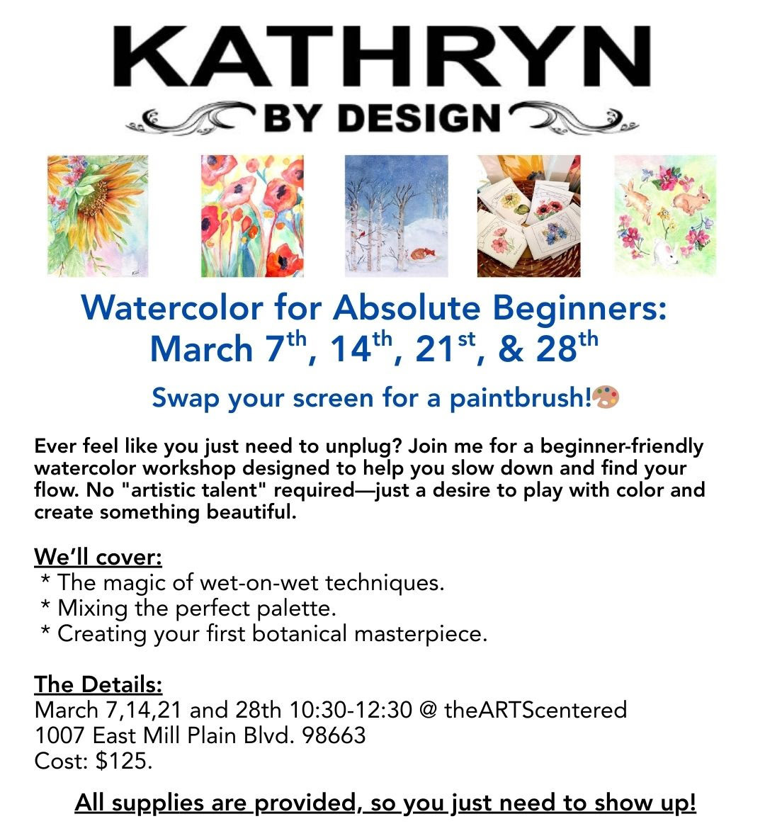 March 7,14,21 and 28th 10:30-12:30 @theARTScentered, 1007 East Mill Plain Blvd. 98663